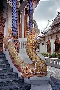 Makara werden an Tempelgebäuden in Thailand häufig zusammen mit einem Kirtimukha (Thai: กิร์ติมุขะ, Sanskrit: „Antlitz der Glorie“, auch Kirttimukha oder Kala) dargestellt, einem löwenköpfigen „Dämonen“ aus der hinduistischen Mythologie, der sich in seinem wilden Hunger selbst auffraß, bis nur noch sein Kopf übrig blieb. So wie der Kirtimukha Vegetation ausspeit, so entspringen dem Maul der Makara ein- oder mehrköpfige Nagas. Bereits an den Tempeln der Khmer befinden sich Makara zusammen mit Kirttimukha über den Eingangstoren, wie zum Beispiel im Banteay Srei und auch im Angkor Wat. Erste Beispiele in Thailand finden sich am Wat Sri Sawai (Thai: วัดศรีสวาย), aber auch im Wat Mahathat (วัดมหาธาตุ), beide in Sukhothai. Die Künstler von Sukhothai übernahmen später den Makara in ihr Repertoire. In der Aureole des Phra Phuttha Chinnarat, der Haupt-Buddha-Statue des Wat Benchamabophit, sind rechts und links zwei elegante Makara integriert, die blumige Flamboyants ausspeien.