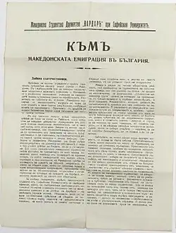 Im März 1920 rief die Studentenvereinigung „Vardar“ die makedonischen Flüchtlingsorganisationen in Bulgarien in einem Manifest auf und erklärte, dass die Studentenvereinigung als Reaktion auf ausländische Kräfte gegründet wurde, die versuchten, makedonische Flüchtlinge in einen selbstzerstörerischen Kampf zu stürzen. Zudem strebte man danach, die makedonische Studenten vorzubereiten und ihnen nationales Pflichtbewusstsein, Patriotismus und Opferbereitschaft im Namen des Befreiungsideals zu vermitteln. Der Appell richtete sich an alle, denen die Sache der makedonischen Bulgaren am Herzen liegt, die Gesellschaft zu unterstützen.[4]