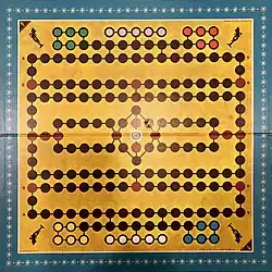 Malefiz ist ein weit verbreitetes Brettspiel von Ravensburger, das 1959 von Werner Schöppner erfunden wurde. Es ist ein Abkömmling des Spiels Pachisi.[1] Der kreuzförmige Spielplan der Vorlage ist verschwunden. Die Regeln zum Schlagen der Figuren sind geblieben und wurden stark herausgehoben. Blockaden werden nicht mehr mit zwei Spielfiguren gebildet, sondern sind eigene Spielsteine.
