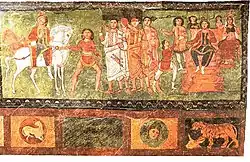 Zur offiziellen Repräsentationskunst des Römischen Reiches zählt die Historienmalerei. Zur Zeit des Wechsels vom 4. zum 3. Jahrhundert v. Chr. entstanden, ist sie nur durch literarische Hinweise und durch eine geringe Anzahl von Reflexen in der Sepulkralkunst fassbar. Diese Bilder zeigten Szenen von gewonnenen Kriegen, eroberten Städten, besiegten Völkern mit ihren Herrschern, sowie Karten mit eingezeichneten Kriegsschauplätzen. Diese wohl mehrheitlich Tafelbilder konnten in Triumphzügen mitgeführt werden und das Volk an dem Sieg des jeweiligen Imperators hautnah teilhaben lassen. Literarische Quellen streichen die originalgetreue Wiedergabe der dargestellten Personen und Schauplätze heraus. Bei dem frühesten erhaltenen Beispiel dieser Gruppe handelt es sich um ein Freskofragment aus dem Fabiergrab vom Esquilin in Rom. Hierbei handelt es sich um einen Teil eines großen Bilderzyklus des frühen 3. Jahrhunderts v. Chr. mit Darstellungen aus den Samnitenkriegen.[3] In vier erhaltenen Registern wird auf die römischen Tugenden hingewiesen, virtus und fides populi Romani.
