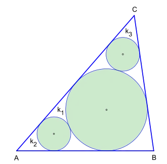 - Gegeben sei ein Dreieck, konstruiere drei Kreise darin so, dass jeder der Kreise tangential ist (das heißt, sie berühren einen Punkt) mit den anderen zwei und mit zwei Seiten des Dreiecks.
