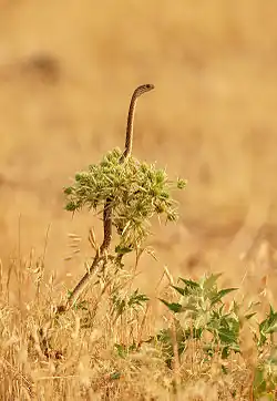 Die Art ist schnell, kann sehr gut sehen und hat eine große Fluchtdistanz. Wenn sie durch die Vegetation kriecht, reckt sie häufig den Vorderkörper hoch, um Ausschau zu halten, weshalb sie herannahende Beobachter schon früh wahrnimmt. Ergriffene Tiere wehren sich durch Umschlingen und beißen heftig zu, wobei auch die Giftzähne eingesetzt werden. Die Art zischt bei Bedrohung, sofern sie nicht ohnehin flieht, laut und ausgiebig.
