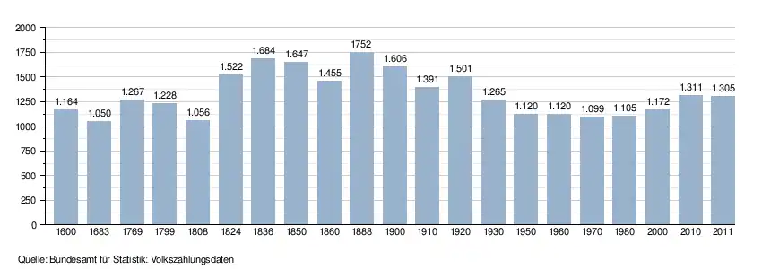 - ↑ Daten der Eidgenössischen Volkszählungen ab 1850 nach Gemeinden. (XLSX; 10 MB) Bundesamt für Statistik, Neuchâtel, 12. Juli 2024, abgerufen am 18. April 2025 (Öffnung in Excel nur über "Anhang/Excel-Datensatz" möglich).