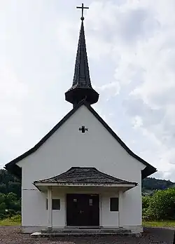 Die Kapelle ist ein Rechteckbau mit sechs rundbogigen Fenstern. Dem ist ein Chor mit zwei Fenstern angeschlossen. Die beiden Bauteile haben Satteldächer unterschiedlicher Höhe. Im Westen sitzt ein Dachreiter darauf. Das Altarbild wurde vom Freiburger Kunstmaler Hans Franke[27] geschaffen. Die heutige Orgel wurde 1970 von der bayerischen Firma Deininger & Renner gebaut und arbeitet mit einer Schleiflade, einer mechanischen Spieltraktur und einer mechanisch-elektrischen Registertraktur. Sie hat ein Manual und ein selbständiges Pedal.[28]