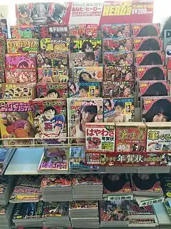 Während im Jahr 1967 in Japan von weniger als 50 Manga-Magazinen insgesamt 78 Millionen Exemplare verkauft wurden, waren es im Jahr 1994 von 260 Manga-Magazinen 1.890 Millionen Exemplare und 2006 1.260 Millionen verkaufte Exemplare.[30] Shōnen Jump, das erfolgreichste Magazin, erlebt wie die meisten anderen seit 1997 einen stetigen Rückgang des Absatzes: Mitte der 1990er-Jahre lag er noch bei sechs Millionen Exemplaren pro Woche – 2015 waren es 2,4 Millionen. In den Jahren zuvor verloren die großen Magazine häufiger 10 % und mehr ihrer Auflage pro Jahr. An zweiter Stelle nach Shōnen Jump steht das Weekly Shōnen Magazine mit etwa 1 Million verkauften Exemplaren pro Woche.[87] Hohe Verkaufszahlen in ihren Sparten hatten 2017 das Kindermagazin CoroCoro Comic (780.000), die Seinen-Magazine Young Jump und Big Comic (je etwa 500.000),[88] das Shōjo-Magazin Ciao (450.000) und die Josei-Magazine For Mrs. und Elegance Eva (150.000).[89]