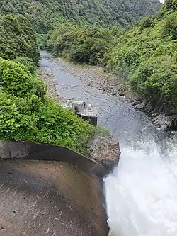 Da nicht zur Stromerzeugung genutzte Wasser fließt über den Mangahao River weiter nach Osten, wo der Fluss aus der Berglandschaft heraustritt und in der offenen Ebene in zahlreichen mäanderförmigen Schleifen schließlich nach 76 km rund 4,5 km südwestlich von Woodville in den Manawatū River mündet.[1][3]