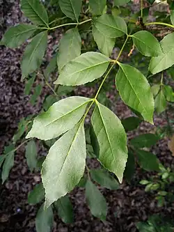 Die gegenständigen und gestielten Laubblätter sind unpaarig gefiedert sowie ungefähr 15 bis 20 cm lang. Es sind meist 5 bis 9 Fiederblättchen vorhanden. Die deutlich gestielten Blättchen sind eiförmig bis elliptisch, lanzettlich, seltener verkehrt-eiförmig, zugespitzt, unregelmäßig gesägt und ungefähr 3 bis 7 cm lang. Ihre Oberseite ist mittelgrün, die Unterseite ist heller und auf den Blattadern vor allem an der Blättchenbasis bräunlich oder weißlich behaart.