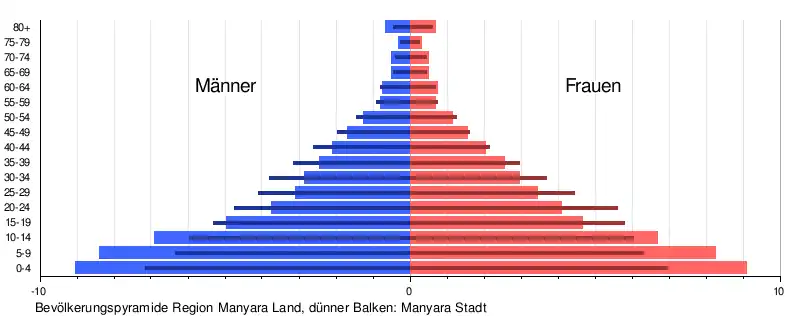 Die Gegenüberstellung der Altersstrukturen der Landbevölkerung und der Stadtbevölkerung zeigt bei der Landbevölkerung die für viele afrikanische Regionen typische Breite Basis, den hohen Anteil an unter Fünfzehnjährigen. Die Stadtbevölkerung dagegen hat eine Ausbuchtung in der Altersgruppe von 15 bis 24 Jahre. Dies deutet darauf hin, dass es eine Zuwanderung von Jugendlichen in die Stadt gibt.[13]