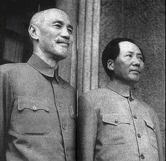 Kurz vor der Kapitulation Japans flammte der Chinesische Bürgerkrieg wieder auf. Verhandlungen zwischen Mao und Chiang brachten kein Ergebnis. Der US-amerikanische Botschafter Patrick J. Hurley versuchte, bei einer Verständigung zwischen KP und Kuomintang zu vermitteln und begleitete Mao am 28. August 1945 nach Chongqing. Die Gespräche sollten sechs Wochen dauern.[193][194][195] Chiang Kai-shek blieb jedoch dabei, eine Zusammenarbeit mit den Kommunisten abzulehnen. Im gleichen Monat unterschrieben Mao und Chiang einen Freundschafts- und Bündnisvertrag, in dem die KP die Kuomintang als Chinas legitime Regierungspartei anerkannte, mit Bestimmungen für Wahlen und einer vage gesicherten Mehrparteiendemokratie.[196] Nach der Kapitulation Japans kontrollierte die Kuomintang zwei Drittel des chinesischen Territoriums, während die Kommunisten einige befreite Gebiete mit dem Zentrum im Grenzgebiet von Shaanxi, Gansu und Ningxia hielten. Insgesamt lebten in den kommunistisch kontrollierten Gebieten 95,5 Millionen Menschen.[192] Die japanischen Soldaten erhielten den Befehl, sich nur Kuomintang-Soldaten zu ergeben; japanische gefangene Soldaten wurden in Aktivitäten gegen die Kommunisten eingesetzt. Die Kuomintang konnte auf diese Art die Rote Armee bis zum Jahre 1947 stark zurückdrängen. Auch die Basis Yan’an musste aufgegeben werden. Mao gab den Truppen der Roten Armee die Anweisung, sich nur auf Kampfhandlungen einzulassen, wenn ihr Sieg sicher sei, und ausschließlich die Guerillataktik anzuwenden.[197]