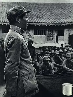 Die Kommunistische Partei befand sich an diesem Punkt in einer aussichtslosen Lage. Mao zog auf einer kurzen Reise nach Hunan die Schlussfolgerung, dass die KPC im Kampf um die Macht nur dann erfolgreich sein könne, wenn sie über eigenes Militär verfügt. Politischer Kampf, Massenbewegung und Einheitsfront seien sinnlos, weil im militarisierten China der 1920er Jahre alle politische Macht aus den Gewehrläufen kommt.[85][86] Nach Maos Ansicht sollte sich eine solche kommunistische Armee aus verarmten Bauern rekrutieren[87] Maos Vorschlag, in schwer zugänglichen Gebieten kommunistische Basen einzurichten, wurde von der Komintern aber nur bedingt genehmigt. Sie setzte nun auf Aufstände gegen die Kuomintang, an deren Planung Mao als Experte für die Mobilisierung von Bauern beteiligt war.[88]