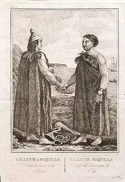 Am 16. Mai 1788 schrieb er, es „fuhr eine Reihe von Kanus in die kleine Bucht, mit Maquilla (so nennt Meares den Häuptling) und Callicum; sie bewegten sich in großer Parade um das Schiff, während sie ein angenehmes Lied sangen mit einer wohlklingenden Melodie: – es waren zwölf dieser Kanus, jedes mit ungefähr achtzehn Mann, der überwiegende Teil in Kleidern aus schönsten Seeotterhäuten, die sie vom Hals bis zu den Knöcheln einhüllten. Ihr Haar war mit weißem Daunen gleichsam gepudert, und ihre Gesichter mit rotem und schwarzem Ocker bedeckt, in der Form eines Haikiefers und einer Art Spirallinie, was sie äußerst wild aussehen ließ. In den meisten Booten waren auf jeder Seite acht Ruderer und ein einziger Mann stand im Heck. Der Häuptling besetzte einen Platz in der Mitte, und war zusätzlich durch eine hohe Haube unterschieden...mit einem kleinen Büschel aus Federn … Der Chor war … äußerst korrekt in Zeit und Tonlage, keine Dissonanz war zu hören. Manchmal machten sie einen plötzlichen Übergang vom hohen zum tiefen Ton...“ Offenbar im Rhythmus ihres Gesangs „schlugen sie mit ihren Rudern gegen das Dollbord des Boots. Am Ende jedes Verses zeigten sie mit ausgestreckten Armen nach Norden und Süden und senkten dabei feierlich ihre Stimmen.“[5]