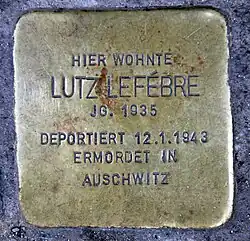 In der Marburger Straße 5 befanden sich jüdische Organisationen wie ein Clubheim für Frauen des jüdischen Frauenbundes[19] oder die zu ihrer Zeit europaweit einzigartige Berliner Jüdische Volkshochschule[20] ihren Sitz. In der Zeit des Nationalsozialismus mussten sie alle weichen. Seit 1942 traf der Holocaust die jüdischen Anwohner auch der Marburger Straße: neunzehn Stolpersteine (darunter der am 8. Juni 2013 verlegte 2000. Stolperstein im Bezirk) erinnern seit Anfang des 21. Jahrhunderts an die Namen der Opfer und weisen zugleich darauf hin, wie sehr die kleine Straße zuvor vom jüdischen Leben geprägt war.