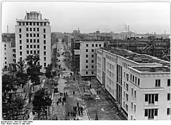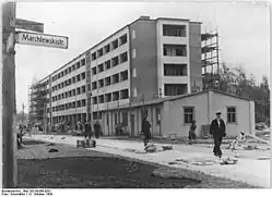 Für das Jahr 1943 sind im Adressbuch 80 Mietshäuser neben den anderen Grundstücken angegeben. Vorwiegend waren es Mietshäuser mit 20 bis 30 Parteien, durch Seiten- und Quergebäude werden auch einige (Memeler Straße 2, 7, 16a, 45, 52, 56) Häuser mit 50 bis 70 Mietern aufgeführt. Zudem bestanden das Lehrerwohnhaus und die Schule unter Memeler Straße 24/25, das Haus 33 der Comenius-Lichtspiele, die Lazarusgemeinde auf dem Grundstück 53/54 der Stadtsynode, Memeler Straße 39 die Feuerwache „Memel“ der Stadt Berlin und auf Grundstück Memeler Straße 38 die Volksschule (Adresse: Fruchtstraße 38). Am Ende des Zweiten Weltkriegs war etwa jedes dritte Haus zerstört. Die anderen Gebäude galten bis auf einen kleinen unbeschädigten Anteil als „wiederaufbaubar“.[51] Die Ruinen waren bis zu Beginn der 1950er Jahre abgeräumt, erste Gebäude waren wieder bewohnbar gemacht.[52] Insbesondere im Nordteil der Straße von der Stalinallee her wurden die Neubauwohnhäuser unabhängig von den bestehenden Katasterflächen errichtet.
