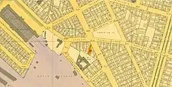 - In dem am 25. Oktober 1931 eingeweihten Gebäude[79] Marchlewskistraße 40 (damals Memeler Straße 53/54) befindet sich die evangelische St. Lazarus-Kirchengemeinde.[80] („Lazarushaus“)[81] Als die St. Markus-Kirche in Friedrichshain (Lazaruskirche in der Romintener Straße, 1936: → Grünberger Straße) im November 1943 durch Bombentreffer beschädigt wurde[82][27] und 1944 das Kirchenschiff bereits offen war, zog die Markus-Gemeinde ebenfalls zum Lazarushaus um. Die Ruine am Standort Grüneberger / Kadiner Straße wurde 1949 abgetragen. Die Lazarusgemeinde war 1892 aus der großen Markusgemeinde hervorgegangen. Das Grundstück der Lazarusgemeinde war vor der Errichtung des Gemeindebaus als Doppelgrundstück 53/54 mit 4700 m² Fläche genannt. Davon war der nördlichere Teil Memeler Straße 53 mit einem Wohnhaus an der Straße bebaut sowie mehreren Gebäuden in der Blocktiefe. Das Grundstück ging 1926 vom Fournierholzhändler Pietsch[83] an die Stadtsynode (Lazarusgemeinde).[84] Das Gemeindehaus wurde in der Mitte der schräg zur Straße liegenden Grundstücksfläche errichtet, es wurde im Krieg beschädigt. Spätestens seit den 1950er Jahren und der neuen Nummerierung wurde das Grundstück als getrennt dargestellt: der Eingang zum Bau mit dem Kirchensaal erfolgt über Marchlewskistraße 40 eine dreieckige Fläche 36 am Norden mit 750 m² gehört allerdings ebenfalls der Lazarusgemeinde. Das kriegsbeschädigte Vorkriegs-Wohnhaus wurde schwer getroffen und es wurden bauliche Veränderungen durchgeführt. Hinter der Grundstücksmauer mit ungefähr 20 m Straßenlänge steht ein eingeschossiges (Rest-)Gebäude an der Nordostecke.