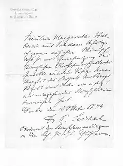 1. Zeugnis des Ober-Hofmarschall-Amts Seiner Majestät des Kaisers und Königs. Gezeichnet: Dr. P. Seidel, Dirigent der Kunstsammlungen in den kgl. Preußisch. Schlössern. Berlin, den 10. Oktober 1894: „Fräulein Margarete Haeberlin aus Potsdam bestätige ich gern auf ihren Wunsch, dass sie mit Genehmigung des königlichen Oberhofmarschallamtes Gemälde aus dem Besitz seiner Majestät des Kaisers und Königs kopiert und dabei ein eifriges und eingehendes Kunststudium bewiesen hat.“ (f. d. R. Joachim Rudolphi, 10. Februar 2003)