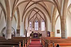 Das Innere der Kirche, das in drei Schiffe unterteilt ist, wird durch ein spätgotisches Netzgewölbe geprägt. Bemerkenswert sind die grotesken Masken die bei einigen Gurtbögen der Gewölbe als Konsolenfiguren dienen. Die Schlusssteine der Gewölbe beherbergen symbolische Motive. So finden sich darunter der Bundschuh und eine sich nach einem Ring ausstreckende Hand, dessen Symbolgehalt ungeklärt ist. Letzteres Motiv findet sich auch an der Außenwand des Chores.[4]