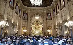 Das Innere der Kirche ist das erste vollständige Beispiel des Barockstils von Johann V. von Portugal; es wurde im 19. Jahrhundert im klassizistischen Stil teilweise umgestaltet. Der Hochaltar ist reich ausgestaltet mit monumentalen salomonischen Säulen, einem Altar aus Silber und einem Bild der Muttergottes der Empfängnis in der Mitte. Der Schnitzmeister João Moreira do Espírito Santo vollendete die Schnitzerei des Hochaltars aus Zedernholz zwischen 1765 und 1773. Domingos Luiz Soares ist unter anderem für die Vergoldung des Hochaltars verantwortlich. Die italienischen salomonischen Säulen, die mit Blumengirlanden und Akanthusdetails versehen sind, ähneln denen des Ziboriums des Petersdoms. Eine Kuppel und zwei massive Oculi in der Chordecke sorgen für die natürliche Beleuchtung des Chores und des Hochaltars. Die Decke des Kirchenschiffs ist im barocken Illusionsstil gehalten und von José Joaquim da Rocha (um 1737–1807) ausgeführt.[10][9][7] Die Kirche hat acht Seitenkapellen: drei an jeder Seite des Kirchenschiffs und eine an jeder Seite des Hochaltars.