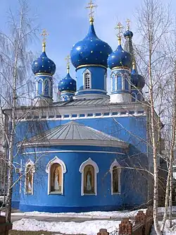 Die Kirche vereint das vorherrschende russische Kathedralmodell – kubische Grundform mit einer zentralen Kuppel und vier kleineren begleitenden Türmen. Die fünf blauen Kuppeln sind mit goldenen Sternen verziert und tragen jeweils ein goldenes Russisches Kreuz. Am hinteren Ende des Kirchenschiffes befindet sich eine Apsis.