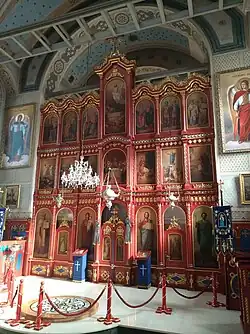 Im Narthexraum führt eine Treppe zur Chorempore hinauf, die sich an der Westseite befindet, und auch der Anbindung an den Kirchturm dient. Durch eine Kolonnade mit massiven Pfeilern betritt man den eigentlichen Kirchenschiffraum. Die Wände der Kirche sind mit verschiedenen floralen und geometrischen Ornamenten in Seccomalerei verziert. Die Kuppel ziert einen Sternenhimmel mit Engeln, die der Apsis ein Christus Pantokrator. Die Denkmalentscheidung des Jahres 2007 erstreckt sich auch auf die Ikonostase, die in den Jahren 1909 und 1910 entstand. Ihre Schnitzerei stammt von einem Serben aus Budapest, die Gemälde vom Maler Marko Gregović aus Mostar. Zu sehen sind zwanzig Ikonen sowie die Kaiserpforte mit der Verkündigungsszene. Die Einfassung ist gold-rot gestaltet, die Arkaden am Rand hingegen in rot-blau mit goldenen Details. Die untere horizontale Reihe zeigt v. l. n. r. St. Nikolaus, Stephanus, die Muttergottes, die Kaiserpforte, Christus Pantokrator, Michael und Johannes der Täufer. Darüber finden sich Bibelszenen: Die Verklärung des Herrn, Die Himmelfahrt der Heiligen Jungfrau, Die Geburt der Allerheiligsten Gottesmutter, Das letzte Abendmahl, Die Geburt Christi, Die Himmelfahrt Christi und Die Taufe Christi. Die oberste Reihe zeigt Konstantin und Helena, Peter und Paul, Matthäus und Markus, Die Himmelfahrt Christi, Lukas und Johannes, Demetrios und Georg sowie Kyrill und Method.[1] Neben dem Altar befindet sich eine Sava-Kapelle.[2]