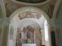 Das östliche Joch des Langhauses ist als Vierung ausgebildet, die mit einer Kuppel überspannt ist. Die Deckenmalerei von 1791 wird Martin Anton Seltenhorn zugeschrieben. Das Altarretabel des um 1790/91 aufgestellten Altars zeigt ein Gnadenbild.