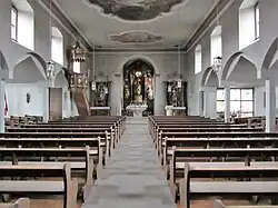 Das Langhaus ist zum östlichen Chor im Untergeschoss des Kirchturms hin ausgerichtet. Der Kirchturm ist im Echterstil errichtet. Die Wände des Langhauses sind als Übergang zu den nördlichen und südlichen Seitenflügeln durchbrochen. Die Einrichtung der Kirche ist barock aus der Entstehungszeit des Langhauses. Die zentrale Figur des Hochaltars, der wie die Seitenaltäre zweisäulig aufgebaut ist, ist eine vergoldete Muttergottes mit Kind. Die Kanzel zeigt die Figuren der vier Evangelisten.