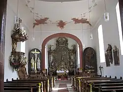 Die verputzte Saalkirche wurde im Auftrag des Grafen Schönborn 1777 nach Plänen von Johann Philipp Geigel erbaut, nachdem der Vorgängerbau wegen Baufälligkeit abgerissen wurde. Sie besteht aus einem Langhaus, einem eingezogenen Chor und dem daran nach Osten angebauten Choranschlussturm, der mit einer schiefergedeckten Zwiebelhaube bedeckt ist. Sein oberstes Geschoss beherbergt die Turmuhr und den Glockenstuhl. Die mit einem Schweifgiebel bedeckte Fassade im Westen ist mit Lisenen in drei Bereiche gegliedert, im mittleren befindet sich das Portal.