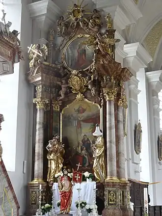 Während der linke Seitenaltar 1737 vom damaligen Pfarrer Johann Michael Wiesner gestiftet wurde, ist der rechte ein Geschenk der Freiherrn von Fraunberg. Dieser ist dem heiligen Sebastian geweiht. Folglich sind auf dem großen Altarblatt die Vorbereitungen zum Martyrium des Heiligen zu sehen. Im Auszug der ist heilige Aloisius von Gonzaga dargestellt. Als Assistenzfiguren fungieren die heilige Katharina von Alexandrien (links) und die heilige Apollonia. Auf der Mensa steht ein um 1680 entstandener Tabernakel, der aus einer unbekannten Kirche hierher übertragen wurde.[5]