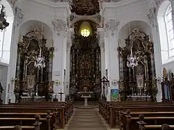 Der Hochaltar des Franz Josef Bergmüller besteht aus vier Säulen, die Gebälkstücke tragen. Das Gebälk ist weitgehend aufgelöst. Auf Heiligenfiguren vor den Säulen wird verzichtet. So wird die Aufmerksamkeit ganz auf das Gnadenbild der auf einer Mondsichel thronenden, von einer Strahlenglorie umgebenen Muttergottes mit Jesuskind und Krone gelenkt. Voluten umrahmen das Gnadenbild, über dem ein Baldachin schwebt. Der Altarauszug löst sich in frei schwingende Linien auf. Die Seitenaltäre haben – wie der Hochaltar – unterschiedlich hohe Säulen. Auch die Baldachine – hier über dem Altarblatt – finden sich wieder. Rocailleschmuck belebt den Altarauszug.