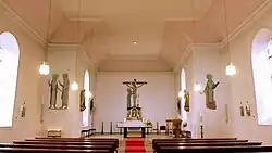 Zur Ausstattung der Kirche gehören eine Kreuzigungsgruppe an der Rückwand des Chorraums, eine Darstellung der Begegnung der heiligen Maria mit der heiligen Elisabeth (Mariä Heimsuchung) auf der linken Wand neben dem Chorraum und der heiligen Luzia auf der rechten Wand, sowie ein Mosaik-Kreuzweg. Geschaffen wurden diese Werke im Jahr 1962 von dem Künstler Albert Kettenhofen (Merzig).[4]