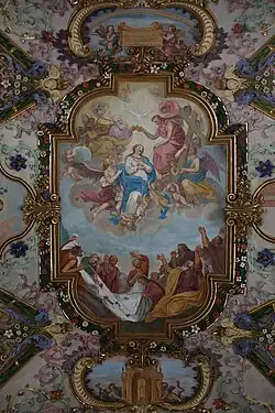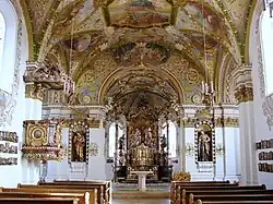 Die Kirche verfügt über zahlreiche Fresken an Decke und Wänden sowie über reichhaltige Stuckverzierungen; an den Kapitellen der Pilaster sind farbig bemalte Akanthusranken zu sehen. Insgesamt 52 Fresken, in durchdachter Weise angeordnet, sind in der Kirche zu sehen. Über die Freskierung ist ein Bericht von 1712 erhalten, der die unterschiedlichen Themen und Motive genau beschreibt.
