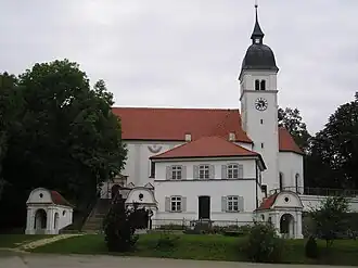 Außenansicht der Wallfahrtskirche Allersdorf, im Vordergrund sind das Priesterwohnhaus und drei der zehn Marienkapellen zu sehen