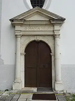 Das Hauptportal der Kirche liegt in einer Flucht zur Südtreppe. Es wird von Säulen flankiert und ist mit einem Dreiecksgiebel bekrönt, der die Inschrift „O MARIA HILF!“ trägt. Das Langhaus besteht aus vier verhältnismäßig breiten Jochen, die von einem reich dekorierten Tonnengewölbe mit Stichkappen überspannt sind und einfache Rundbogenfenster enthalten. Die Jochtrennung erfolgt im Innenraum durch doppelte Pilaster. Das westliche der vier Joche wird von einer Empore mit gerader Brüstung überdeckt. Der Raum unter der Empore ist durch ein schmiedeeisernes Gitter vom übrigen Kirchenraum getrennt. Das östliche Joch öffnet sich nach beiden Seiten zu zwei kurzen Querschiffen. Sie umfassen je ein Joch und besitzen einen dreiseitigen Schluss, der jeweils einen Nebenaltar enthält. An der Westseite verfügen die Querarme jeweils über ein eigenes Portal.[6]