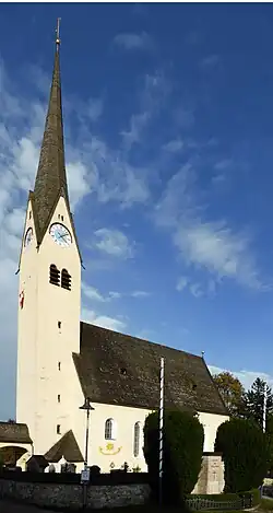 Das annähernd geostete Langhaus mit steilem Satteldach ist inmitten eines Friedhofs errichtet, dessen Ummauerung auf das 16./17. Jahrhundert zurückgeht.[1] An der Südseite steht eine kleine Friedhofskapelle mit Haubendach und Dachreiter.