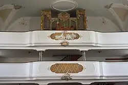 - Die Stuckkanzel wurde um 1766 geschaffen. Das Fresko am Kanzelkorb stellt den Guten Hirten dar und wird Joseph Christ zugeschrieben.
