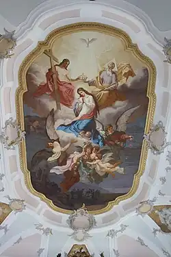Das Langhausfresko wurde 1766 von Joseph Christ geschaffen. Zentrales Thema ist die Verehrung Marias durch die vier Erdteile. Seitlich werden die Eltern Marias dargestellt, die heilige Anna und der heilige Joachim, und die Eltern von Johannes dem Täufer, der heilige Zacharias und die heilige Elisabeth.