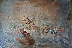 Der Tiroler Johann Jakob Zeiller ist der Meister der Freskomalerei. Das Deckenfresko im Chor gibt die Anbetung des Lammes aus der Offenbarung des Johannes wieder. Das 30 Meter lange und 15 Meter breite Deckengemälde im Langhaus zeigt die Zisterzienser, geführt von allegorischen Figuren der Gelübde und Tugenden, auf den Wolken vor Maria und der allerheiligsten Dreifaltigkeit. Die Verstoßenen hingegen stürzen hinab. Vorbild war das Fresko in der neapolitanischen Kirche S. Domenico Maggiore von Zeillers Lehrer Francesco Solimena.
