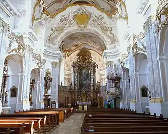 Die Kirche ist eine Wandpfeilerkirche mit eingezogenem Chor. Fischer gab ihr eine innere Raumschale mittels verkleideter Pfeilerfronten, abgerundeten Ecken und besonders in den Raum hineinragenden Emporenbrüstungen, welche die Wandpfeiler in konvexen Schwüngen verspannen. Der ganze Raum wird von einer großen, im Halbkreis geführten Tonne abgeschlossen. Auch der verhältnismäßig tiefe Chor wird von einer Tonne überwölbt.