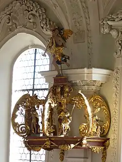Die marmorierte Kanzel wurde um 1700 gefertigt. Der polygonale Kanzelkorb besitzt Nischen mit dazwischenliegenden Säulchen. In den Nischen sind Figuren der vier Evangelisten mit ihren Symbolen angebracht. Der Schalldeckel wird von einem Posaunenengel auf Akanthusvoluten bekrönt. Darunter befinden sich ein Schmerzensmann und vier Kirchenväter. An der Schaffung der Kanzel und der sonstigen Kircheneinrichtung ist eine Mitarbeit des 1683 in Mariazell geborenen Bildhauers Franz Martin möglich.
