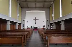 Der Innenraum wird von der Lichtführung und den für die Fenster gewählten Farben beherrscht. Der Gottesdienstraum ist klassisch aufgeteilt mit einem durch zwei Bankblöcke auf den Altar führenden Mittelgang und einer Orgelempore über dem Eingang. Der Altarraum ist durch einen Bogen und ein Podest hervorgehoben und wird durch den verdeckten Lichteinfall aus den Fenstern des Chores zusätzlich betont. Die in Pastelltönen gehaltene Ausstattung kontrastiert mit den intensiv farbigen runden Fenstern der Seitenschiffe, die Szenen aus dem Leben Mariens darstellen.