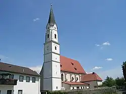 Die um 1500 erbaute Kirche zählt zu den bedeutendsten spätgotischen Kirchen der Region. Es ist anzunehmen, dass Fachleute der Bauhütte in Braunau am Inn (möglicherweise Wolfgang Wiser) am Bau beteiligt waren, worauf originelle Details der Außengliederung und der Gewölbefiguren hindeuten. Der Bau der Kirche wurde von einer Bruderschaft der Schiffer gefördert. In den Jahren 1971–1973 erfolgte eine Restaurierung, bei der Anbauten auf der Südseite hinzugefügt wurden.[1]