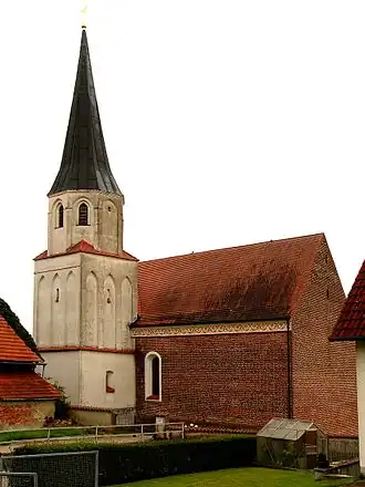 Die nach Osten ausgerichtete Saalkirche umfasst einen nur um die Mauerstärke eingezogenen Chor mit zwei Jochen und Schluss in drei Achteckseiten sowie ein Langhaus mit vier Jochen, die unter einem gemeinsamen Satteldach vereinigt sind. Das Äußere des unverputzten Backsteinbaus wird durch Dreieckslisenen und den für die Landshuter Bauhütte typischen Dachfries gegliedert. Während der Chor noch original spätgotische, spitzbogige Fensteröffnungen enthält, wurden diese im Langhaus barock ausgerundet. Charakteristisch ist der gedrungen wirkende, verputzte Chorflankenturm, der nördlich am Chor angebaut ist. In dessen quadratischem Untergeschoss ist die Sakristei untergebracht. Darüber befindet sich ein weiteres, ungleich höheres quadratisches Geschoss, das mit Spitzbogenblenden verziert ist. Der achteckige Oberbau wird ebenfalls von Spitzbogenblenden aufgelockert, die teilweise spitzbogige Schallöffnungen enthalten. Den oberen Abschluss bildet ein achtseitiger Spitzhelm mit Kugel und Kreuz. Am westlichen Langhausjoch ist südlich eine offene Vorhalle angebaut, die den einzigen Zugang zum Kircheninneren, ein spitzbogiges, beidseits gefastes Portal, enthält.[1]