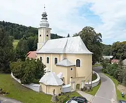Das gemauerte, mit der Figur des Erzengels Michael geschmückte Tor beim Zugang stammt aus der Mitte des 18. Jahrhunderts. Das Pfarrhaus aus der zweiten Hälfte des 18. Jahrhunderts wurde Ende des 19. Jahrhunderts neugotisch umgebaut. Südlich der Kirche steht ein Bildstock mit dem böhmischen Landesheiligen Johannes Nepomuk (1730). Zwei weitere Bildstöcke aus dem 18. Jahrhundert zeigen Ecce Homo und Maria Immaculata. Das Beinhaus datiert von 1613.