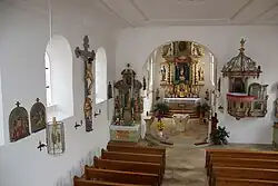 Der Innenraum des Langhauses ist mit einer Flachdecke mit Hohlkehle überspannt, der des Chors mit einem Stichkappengewölbe, das auf hängenden Konsolen der Wände ruht. Zur Kirchenausstattung gehört ein Hochaltar von 1687, der im 18. Jahrhundert an den Seiten mit den Statuen des heiligen Joachim und der heiligen Anna ergänzt wurde.