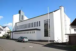 Die Kirche liegt am Nordufer der Lahn. Sie ist als rechteckiges Langhaus mit niedrigen Seitenschiffen und einem hohen Chor konstruiert. An der Außenseite der Ostwand ist eine asymmetrische Giebelwand, die mit einem Turmaufsatz mit Kreuz gekrönt ist. Im Turmaufsatz befinden sich zwei Glocken. Ebenfalls in der Ostwand befindet sich der Eingang mit den Worten: „Sieg Christi am Kreuz über den Tod“ und einer Kreuzesdarstellung am linken Türflügel. In der Kirche sind große, farblose Fenster, und an der Altarwand hängt ein Holzkreuz. Rechts vom Altar sind die Sakramentsschränke. An der Ostwand steht die Orgel.