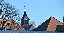 Der Dachreiter ist ein fast quadratischer Fachwerkaufbau mit spitzbogigen Klangarkaden und ziegelgedecktem Dach.