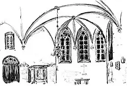 Der Historiker Werner Spieß vermutete, dass es sich bei der Maria-Magdalenen-Kapelle um die Hauskapelle der Geistlichkeit des nur wenige Meter nordöstlich des Bauwerks gelegenen Braunschweiger Doms gehandelt haben könnte.[12] Ende des 15. Jahrhunderts wurde die erste Kapelle durch die Maria-Magdalenen-Kapelle ersetzt, deren Grundstein von 1499 erhalten ist. Finanziert wurde dieser Neubau ganz oder zu Teilen aus Geldern, die der Dekan Johannes Blecker und die drei in der Inschrift genannten Kanoniker zur Verfügung stellten. Es handelte sich um ein kleines, polygones, spätgotisches Gebäude. Den Innenraum überdachten zwei Joche mit Kreuzrippen, eine 3/8-Apsis bildete den Abschluss. Von den fünf Fenstern, zeigte eines auf der Nordseite Maria im Strahlenkranz mit dem Jesuskind auf dem Arm und der Inschrift Anno domini m° v° i° (im Jahre des Herrn 1501).[8]