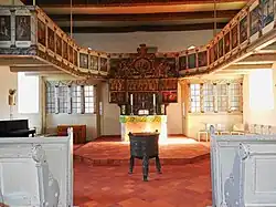 Der Holzbalkendecke des Innenraums zeigt noch Reste der Ausmalung von 1732, die offenbar auch diverse Rundbilder auf den Fensterseiten umfasste.