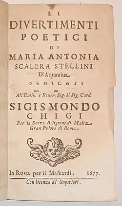 - ↑ Maria Antonia Scalera Stellini: Li Divertimenti poetici di Maria Antonia Scalera Stellini. Mascardi, Rom 1677, OCLC 800795774.
