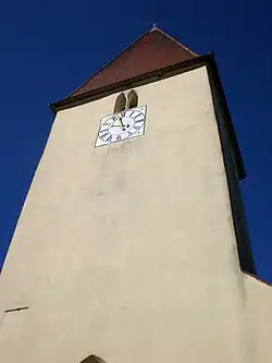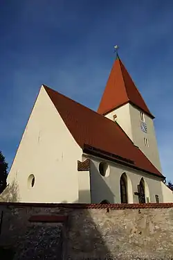 Der Chorturm wurde im 13./14. Jahrhundert gebaut. Er wurde in der ersten Hälfte des 15. Jahrhunderts zur Unterbringung der Turmuhr und des Glockenstuhls aufgestockt und mit einem Pyramidendach bedeckt. Das an ihn angebaute Langhaus, das mit einem Satteldach bedeckt ist, wurde 1660 erneuert und erweitert. Der Innenraum des Chors, d. h. das Erdgeschoss des Chorturms, ist mit einem Kreuzrippengewölbe überspannt, der des Langhauses mit einer Flachdecke. Zur Kirchenausstattung gehört ein um 1750/60 gebauter Altar, der mit vier Säulen gegliedert ist. In der Mitte befindet sich ein Gnadenbild mit einer Pietà von 1370/80. Die Orgel auf der Empore hat sechs Register, ein Manual und Pedal und wurde 1891 von Joseph Bittner gebaut.[1]