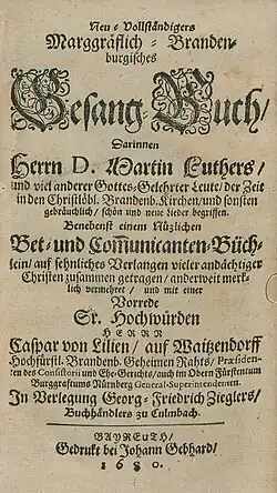- ↑ a b Caspar Lilien: Rechtschaffener Christen einiger Hertzens-Trost. Bey dem Hoch-Fürstl. Leichbegängniß Der ... Frauen Maria Elisabeth, Marggräfin zu Brandenburg ... Deß ... Herrn Georg Albrechtens, Marggrafens zu Brandenburg ... Gemahlin, Hochseeligsten Andenckens, Als Ihrer Durchläuchtigkeit Fürstlicher Cörper, den 26. Augusti des 1664. Jahres, in das Fürstliche Brandenburgische Erb-Begräbnis zu Bayreuth ... beygesetzet worden, Aus den LXXIII. Psalm v. 23. seqq. erkläret Durch Caspar Lilien ... Gebhardt, Bayreuth 1664.